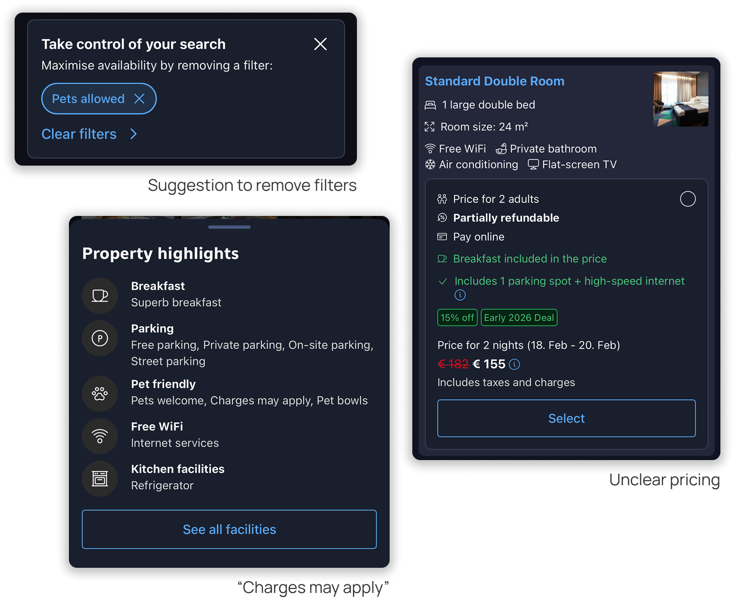 To make pricing and offers clearer I regrouped Booking’s many offers (they have a lot!) while keeping the original card placement and content. Minor tweaks to spacing and visual hierarchy can go a long way.